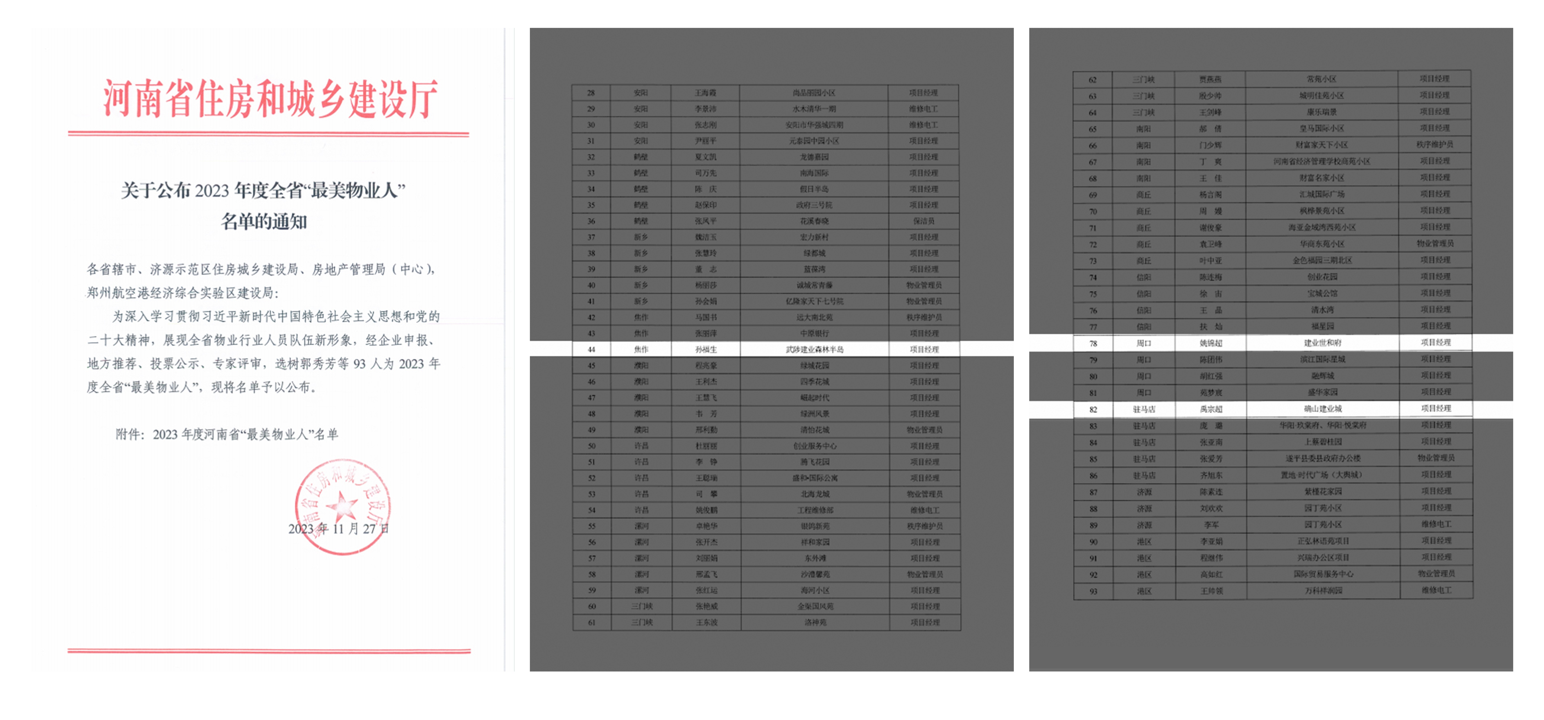 11月27日,河南省住房和城鄉(xiāng)建設廳發(fā)布了2023年度全省“最美物業(yè)人”名單,經(jīng)過專家評審,建業(yè)新生活周口城市公司姚錦超、駐馬店城市公司禹宗超、焦作城市公司孫福生三人入選該榜單。