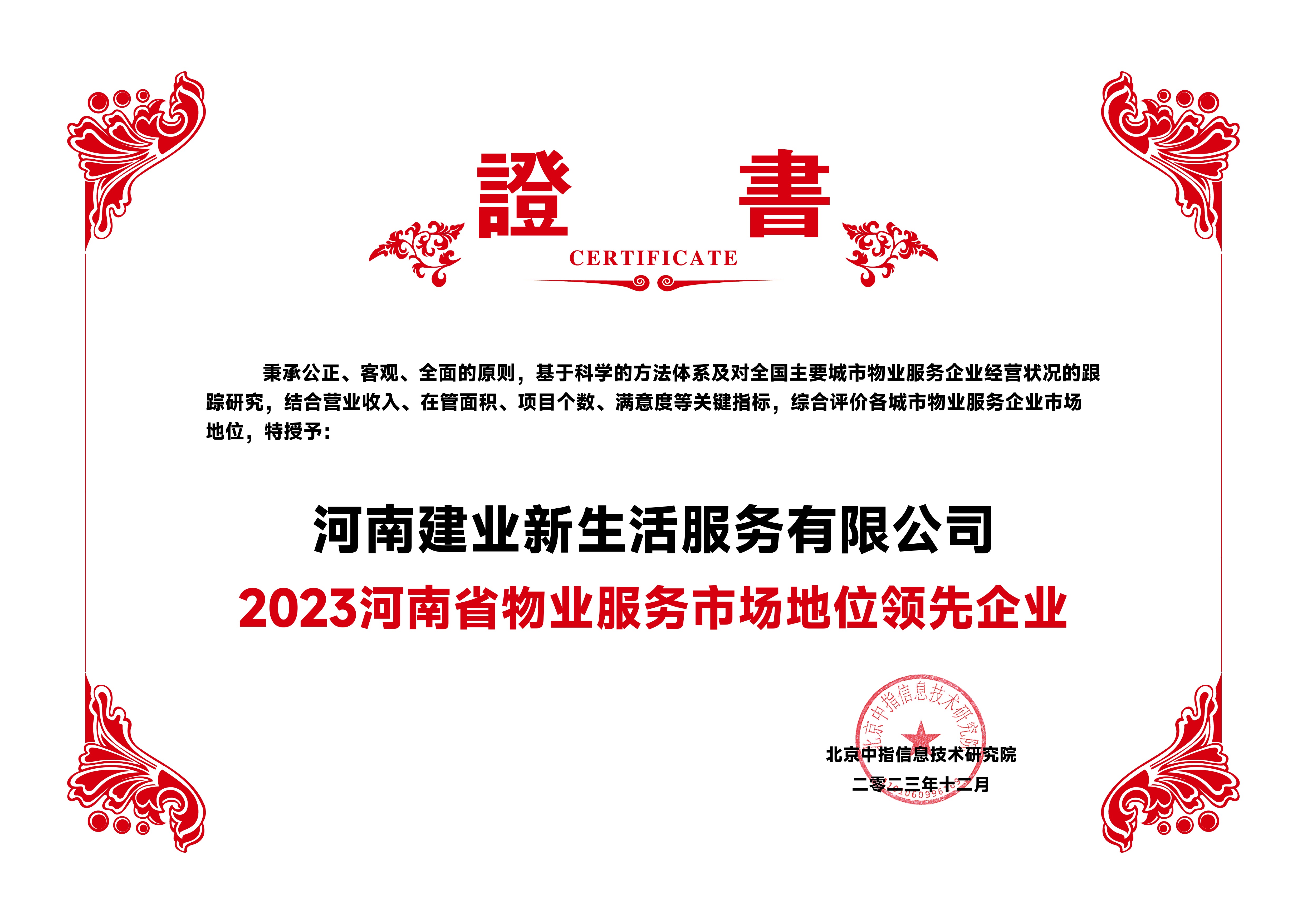 2023年12月7日,由北京中指信息技術(shù)研究院主辦,中國(guó)房地產(chǎn)指數(shù)系統(tǒng)、中國(guó)物業(yè)服務(wù)指數(shù)系統(tǒng)承辦的“2023中國(guó)房地產(chǎn)大數(shù)據(jù)年會(huì)暨2024中國(guó)房地產(chǎn)市場(chǎng)趨勢(shì)報(bào)告會(huì)”在北京隆重召開(kāi)。河南建業(yè)新生活服務(wù)有限公司憑借雄厚的綜合實(shí)力,榮膺“2023中部區(qū)域物業(yè)服務(wù)市場(chǎng)地位領(lǐng)先企業(yè)(TOP1)”“2023河南省物業(yè)服務(wù)市場(chǎng)地位10強(qiáng)企業(yè)(TOP1)”。 會(huì)上發(fā)布了“2023中國(guó)物業(yè)服務(wù)上市公司ESG測(cè)評(píng)研究報(bào)告”。中指研究院、中信證券研究部、北京秩鼎公司聯(lián)合對(duì)物業(yè)管理行業(yè)ESG體系開(kāi)展研究與測(cè)評(píng),對(duì)59家物業(yè)服務(wù)上市公司2022年度ESG報(bào)告表現(xiàn)進(jìn)行了測(cè)評(píng)研究,將ESG報(bào)告評(píng)分按照總體得分排序。建業(yè)新生活榮獲“2023中國(guó)物業(yè)服務(wù)