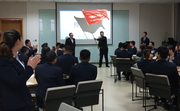 隨后,張總為新項(xiàng)目經(jīng)理團(tuán)隊(duì)授旗,本期培訓(xùn)班班長巨業(yè)平帶領(lǐng)大家在班旗下宣誓,以表決心。
