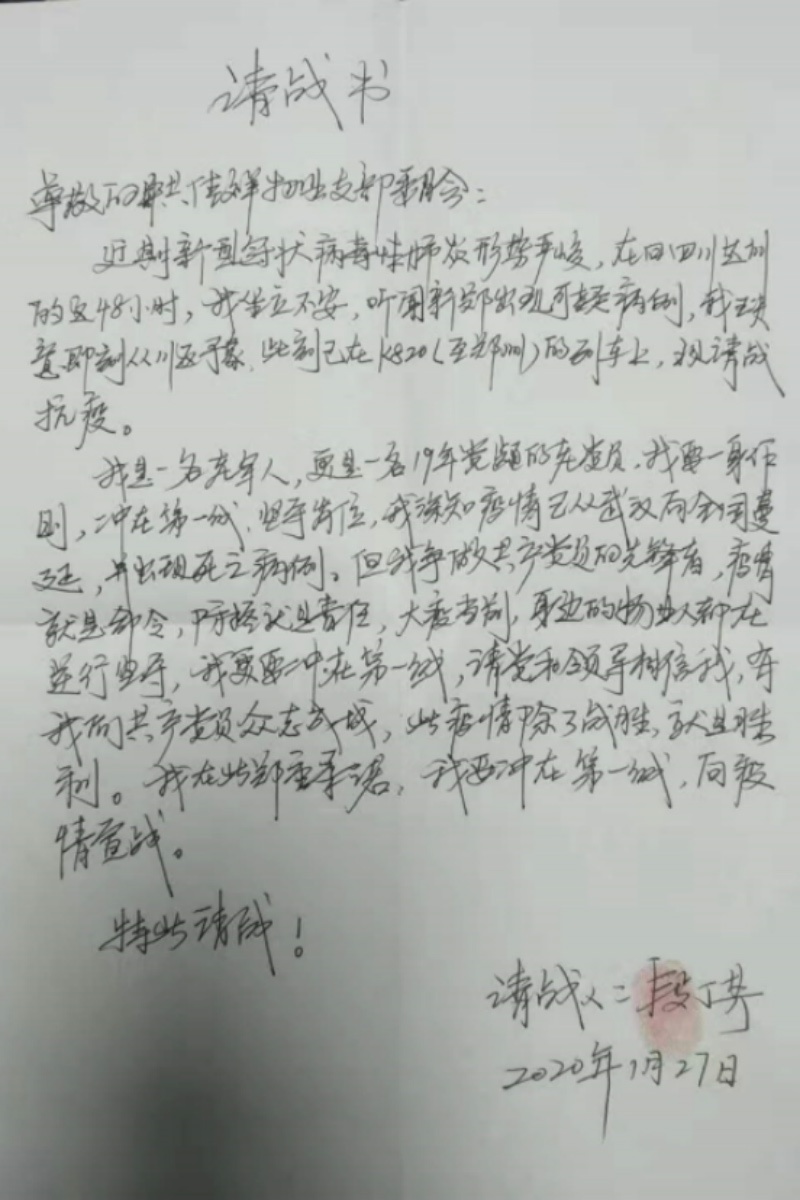 但想到了20年前入黨時的誓詞,他堅(jiān)定上前,并在回崗的火車上寫下了請戰(zhàn)書:“我鄭重承諾,我必須回到防疫第一線,向疫情宣戰(zhàn)!”正是靠著這份承諾,讓他堅(jiān)定了抗擊疫情必勝的信心。