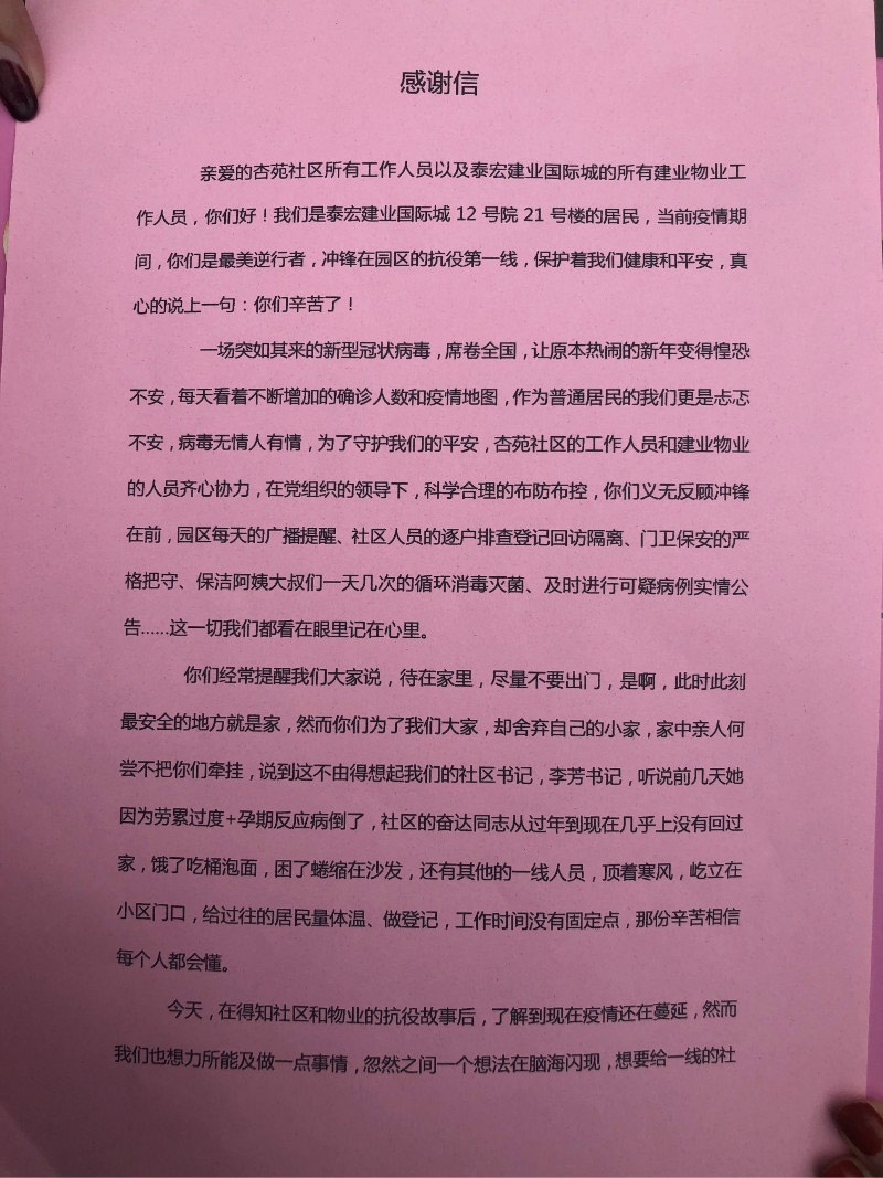 2月14日情人節(jié),鄭州泰宏建業(yè)國際城12號院21號樓的業(yè)主代表,帶著匯聚21號樓89名業(yè)主心意的防疫物資,為建業(yè)物業(yè)和杏花苑社區(qū)送來一篇長達千字的表白長文。