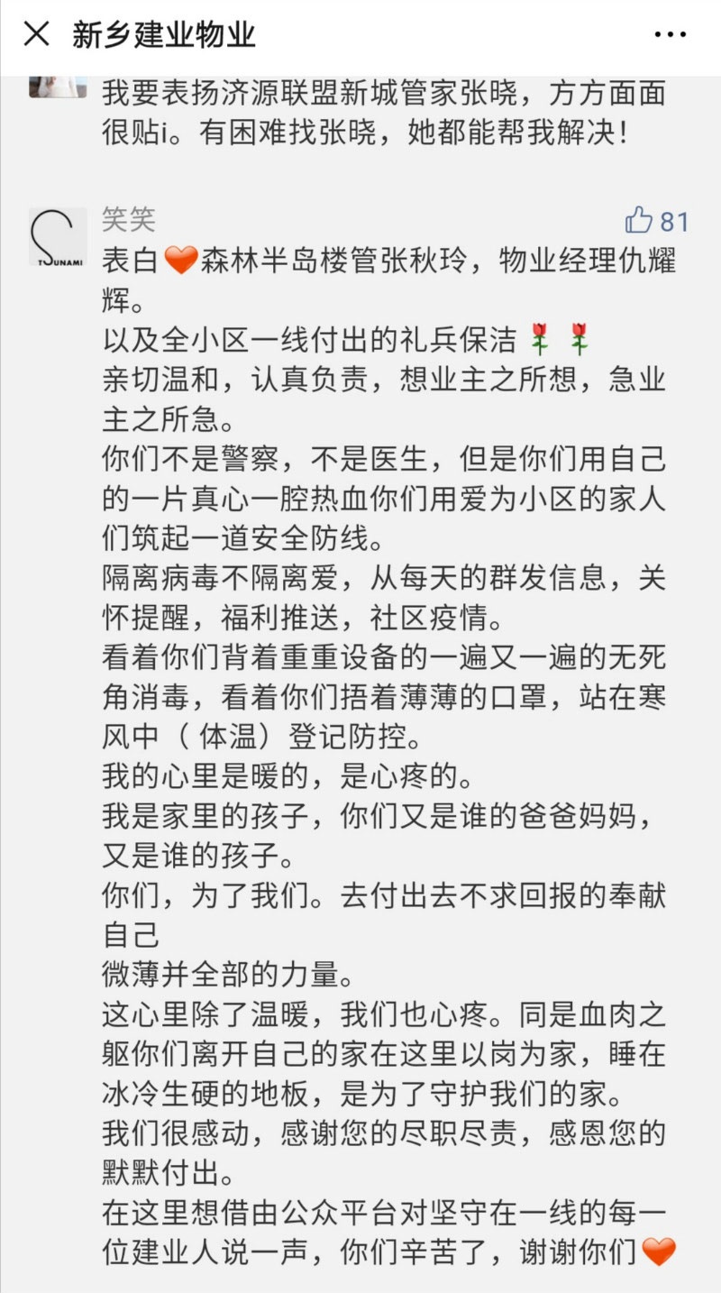 活動一經(jīng)發(fā)布,600余位業(yè)主花式留言表白建業(yè)物業(yè)工作人員,讓人心頭充溢著溫暖。