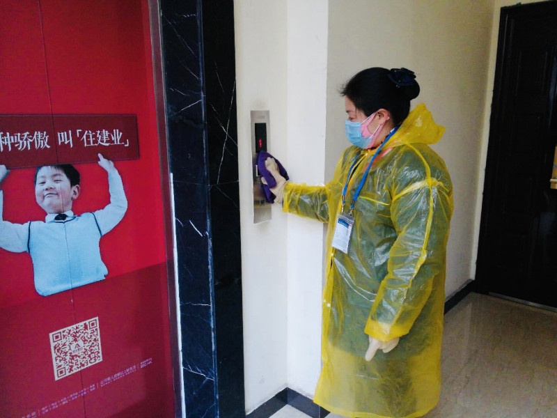 電梯按鍵最常被接觸到,對它循環(huán)消毒是保潔員每天要做的事,剛吃完午飯,平頂山十八城保潔員程利娟就趕到各個樓層對電梯按鍵進(jìn)行消毒。