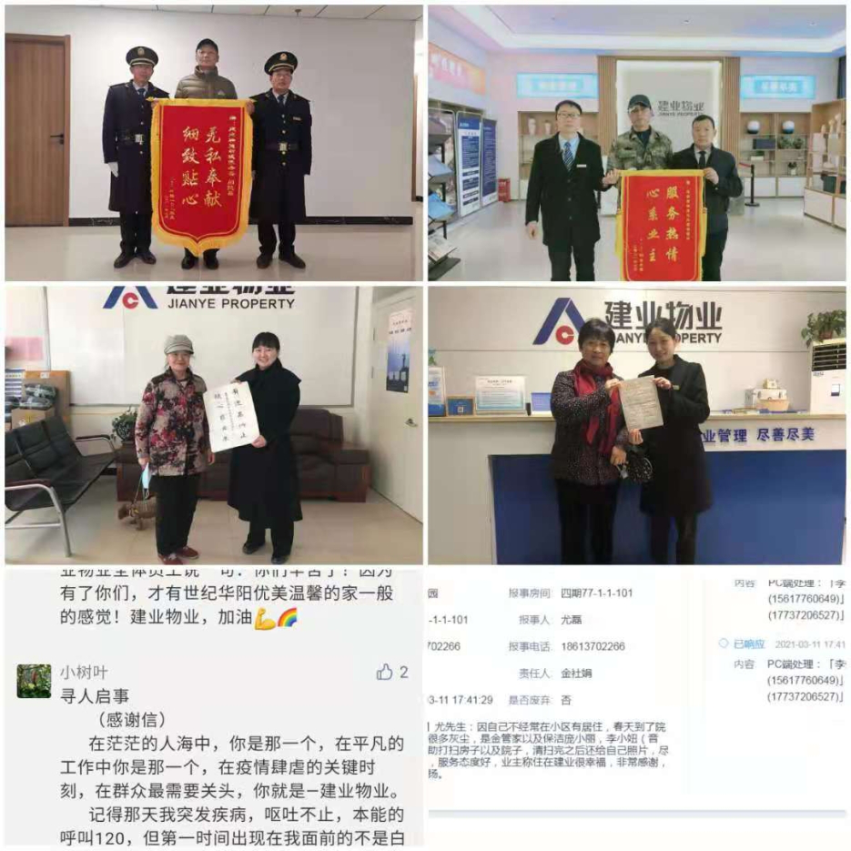 建業(yè)物業(yè)幸福公約需要正能量來(lái)打造,每一位建業(yè)物業(yè)人都散發(fā)著暖陽(yáng)的溫度,呵護(hù)著業(yè)主的幸福生活。3月期間,建業(yè)物業(yè)在管園區(qū)內(nèi)共涌現(xiàn)出好人好事627件,其中錦旗124面,感謝信89封,其他致電表?yè)P(yáng)等416次。