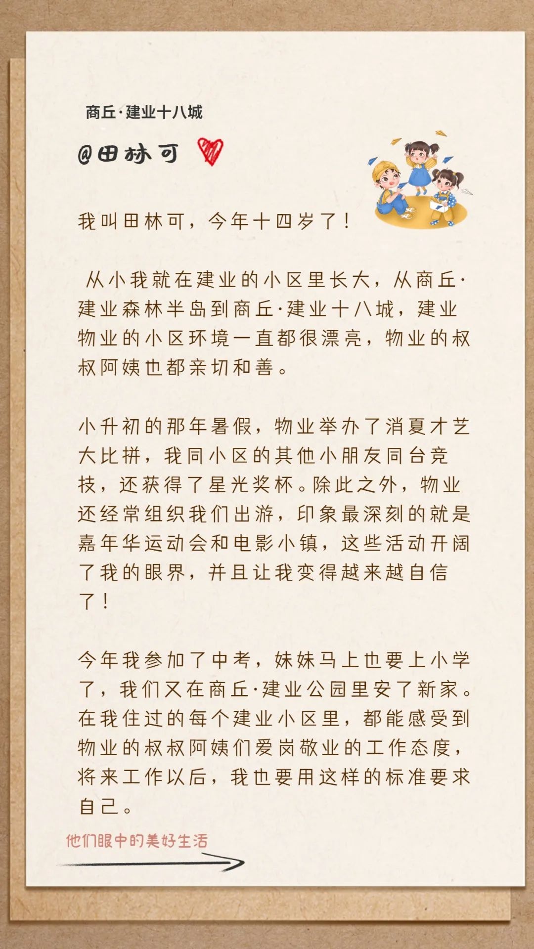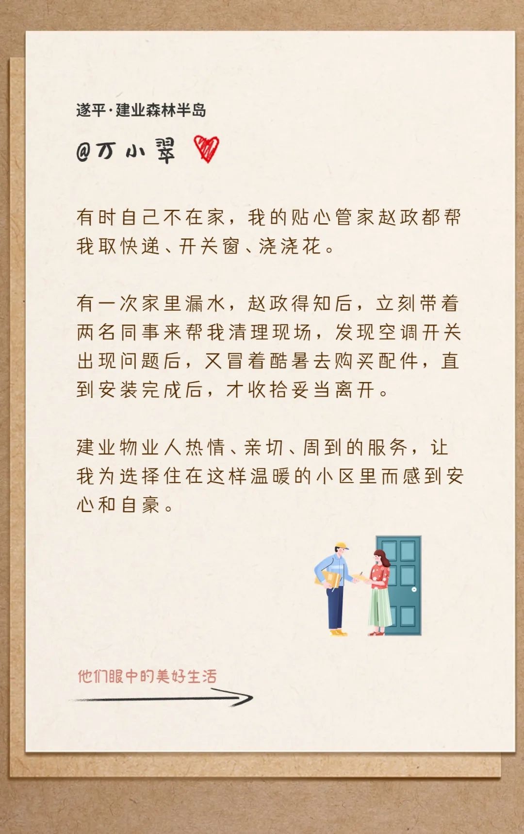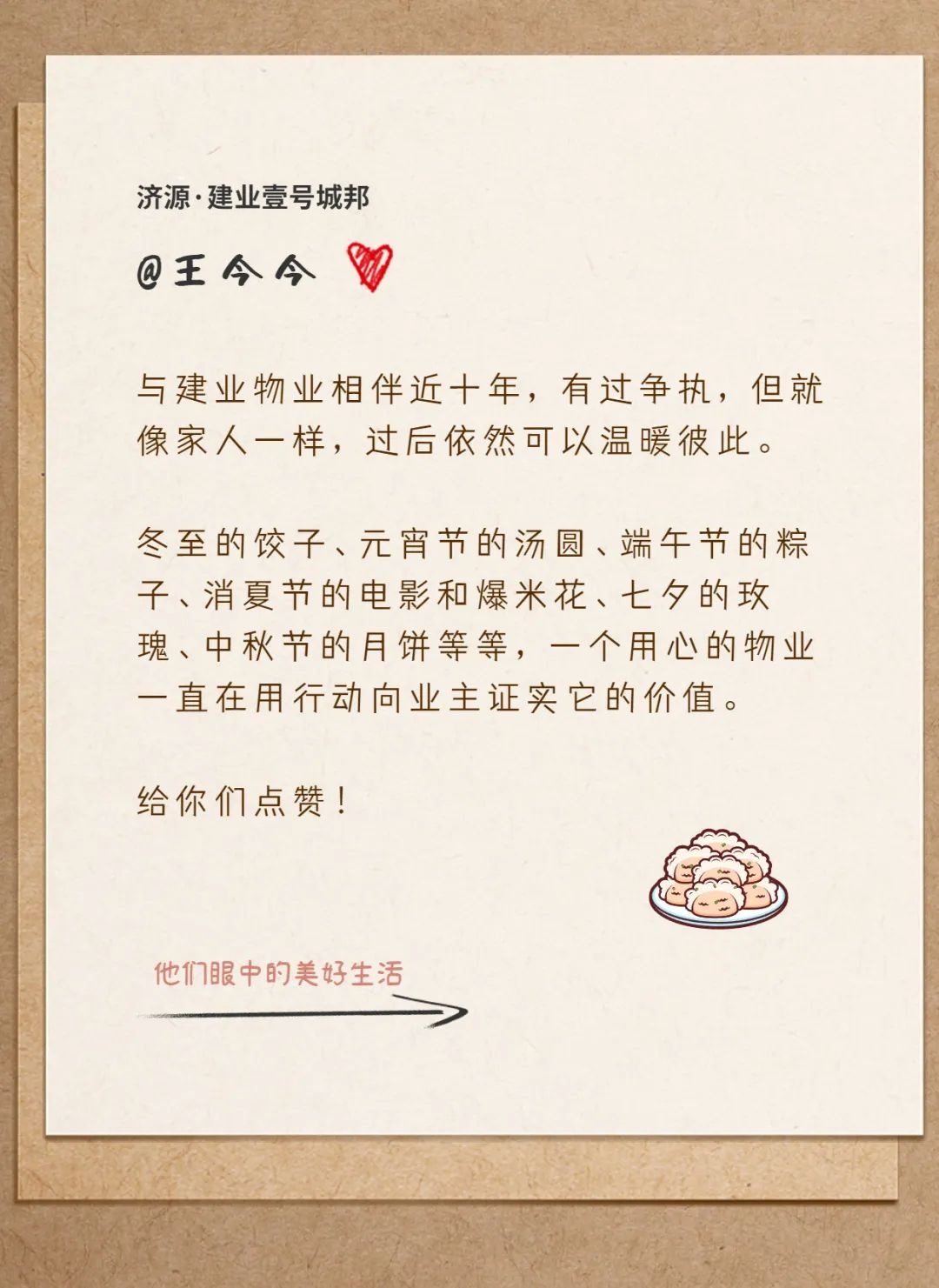 建業(yè)物業(yè)竭力為業(yè)主制造一份份美好,而業(yè)主們也在用真摯懇切的情感和樸實(shí)有力的文字,一字一句地記錄著建業(yè)物業(yè)人的付出,表達(dá)著自己內(nèi)心的感動(dòng)和認(rèn)可。