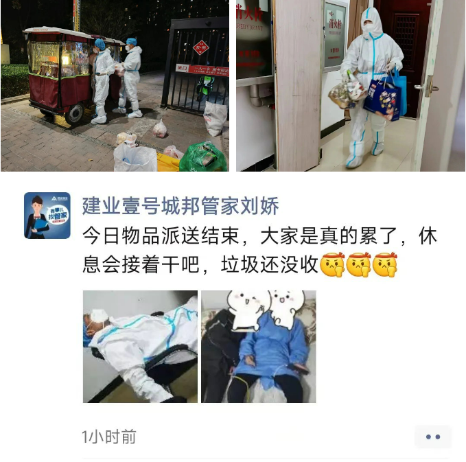 在封控的這段時(shí)間里,她每天都要走超過40000步。每天早上5點(diǎn)多,劉嬌嬌就要起床準(zhǔn)備,開始協(xié)同醫(yī)護(hù)人員進(jìn)行入戶核酸檢測,與此同時(shí),細(xì)心的她還主動詢問每戶業(yè)主的服務(wù)需求。樓道消殺、物資配送……忙完這些,稍作休息,她還要再逐戶清收生活垃圾,等拖著一身的疲憊躺在辦公室的地鋪上時(shí),往往已是午夜。